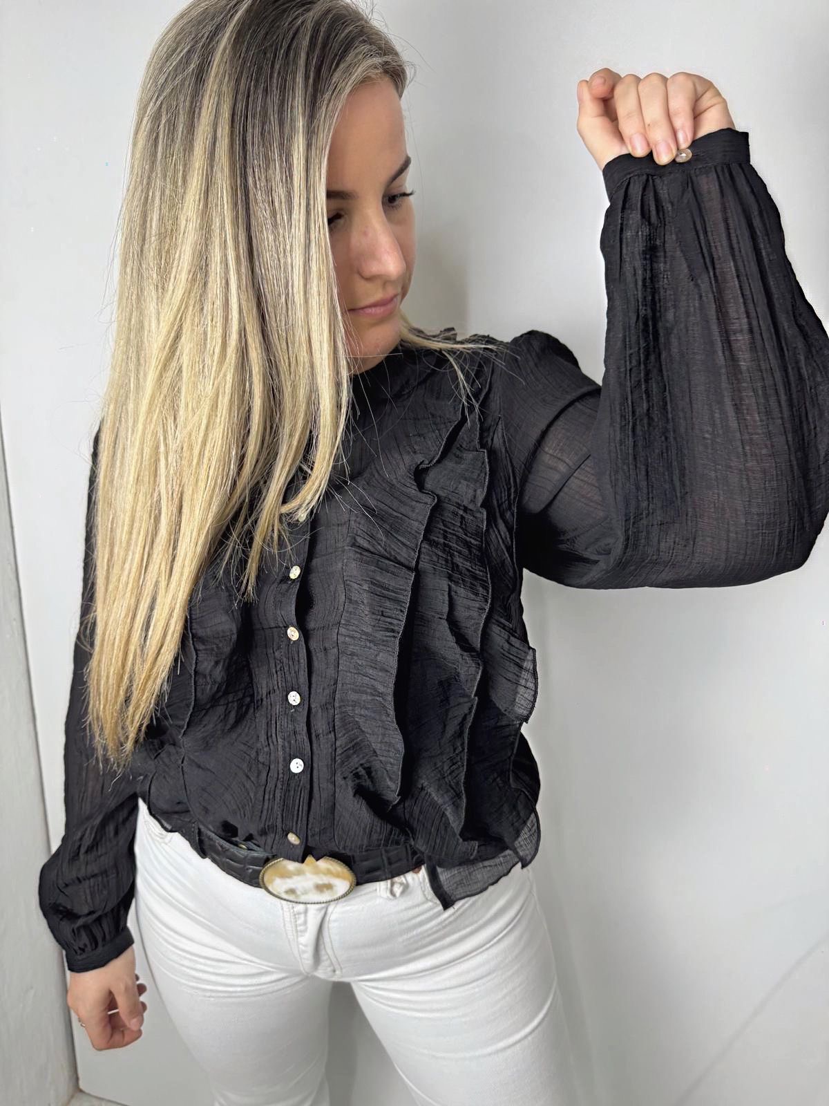 Camisa de Tencel liviana con volados románticos y manga larga. De caída suave y textura aireada, ideal para sumar un toque delicado y fresco a cualquier look.